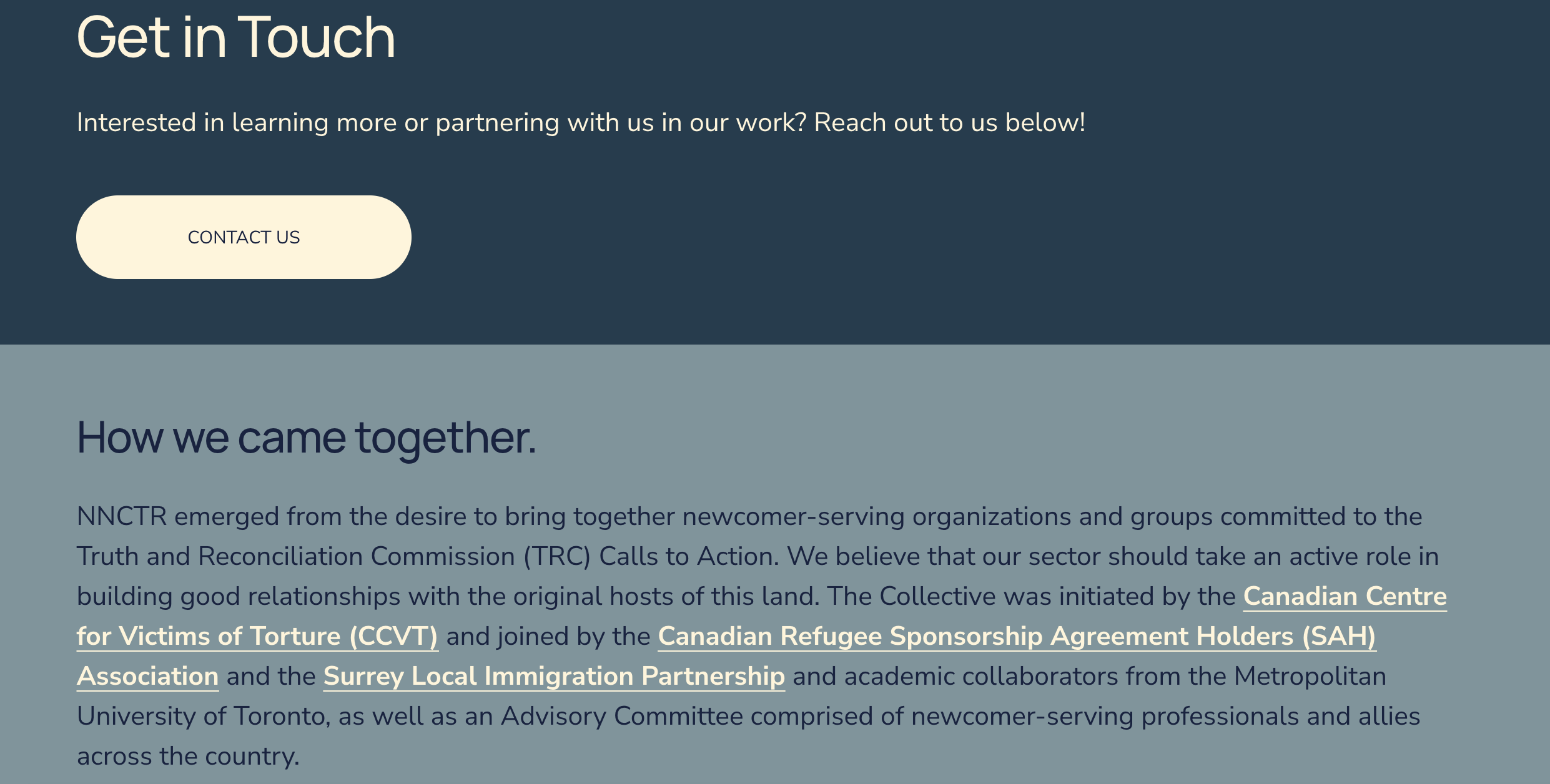 I supported the National Newcomer Collective for Truth and Reconciliation in structuring a simple website that communicates its mission and invites participation without requiring prior familiarity with the topic.